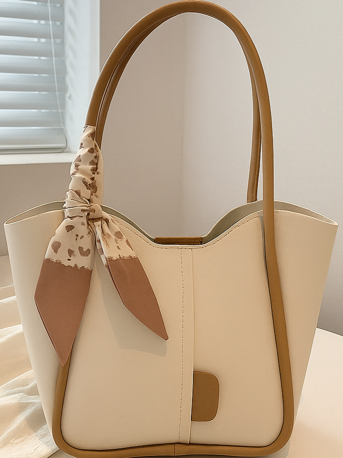 a stunning fusion of clean minimalism and soft feminine detail. This structured ivory tote is outlined in rich caramel tan piping and finished with a delicately patterned scarf bow, bringing a whisper of charm to your modern wardrobe.