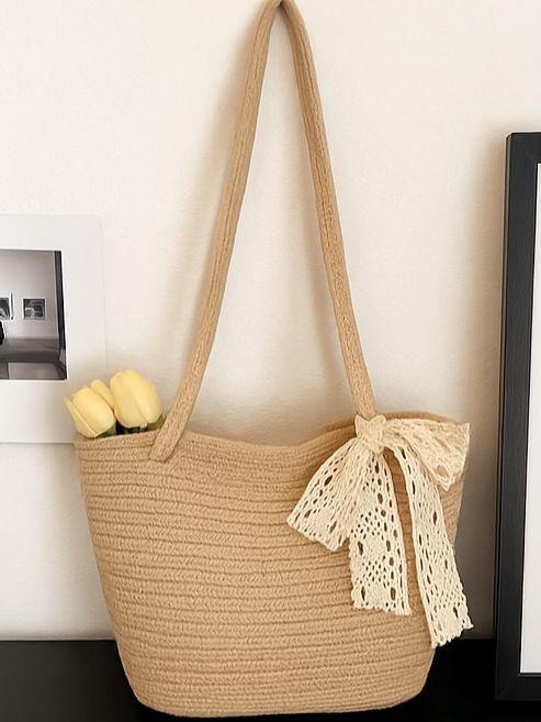 Meet the Honey Lace Meadow Tote, your go-to bag for cozy cottagecore days and sweet city strolls. Crafted with a natural woven texture in soft honey beige, this shoulder tote captures a serene, earthy charm. A delicate lace ribbon bow adds the perfect vintage touch, making it as dreamy as it is functional.