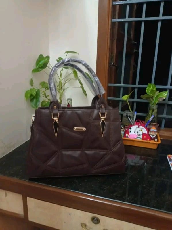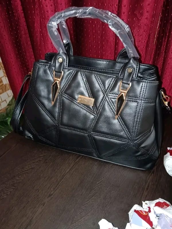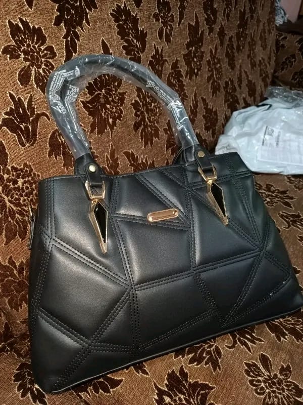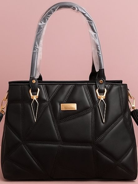 The Noir Élan handbag is a bold embodiment of contemporary charm and everyday functionality. Crafted from high-quality faux leather, its striking geometric stitching and gold-tone accents lend it a designer-inspired edge. The bag features sturdy double handles, an adjustable shoulder strap, and a spacious interior perfect for both work and casual outings. With a zippered back pocket for quick access and a luxe finish, Noir Élan is your go-to accessory for confident, chic style.